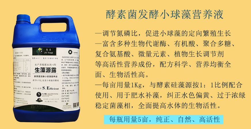 【适用范围】适用于土池、高位池、工厂化车间的鱼、虾、蟹各种水产养殖水体的小球藻的培养、养护,用于与